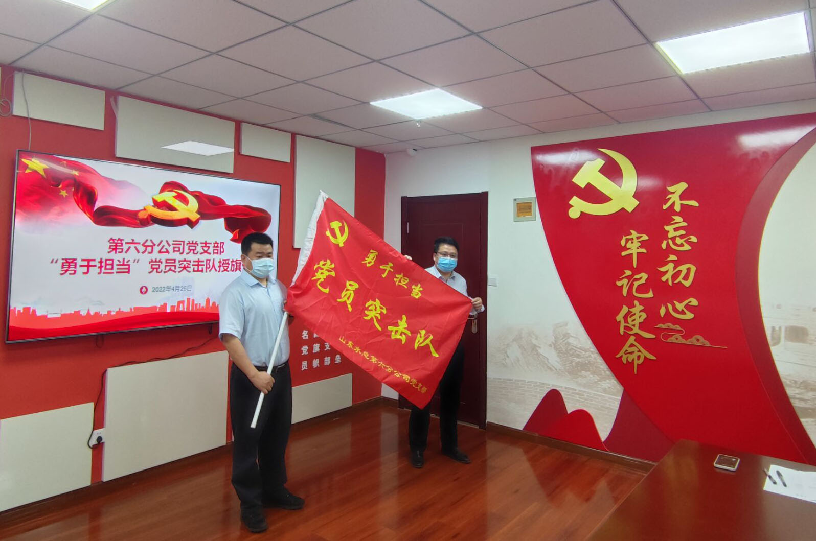 4月26日上午,第六分公司举行“勇于担当党员突击队”授旗仪式,以动员激励党员在疫情防控、生产经营和安全生产工作中更好发挥先锋模范作用。